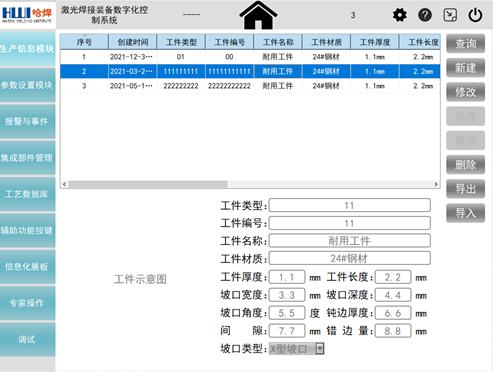 李榮團(tuán)隊(duì)開發(fā)了一套激光焊接裝備數(shù)字化控制系統(tǒng)人機(jī)界面軟件,對(duì)于提升設(shè)備整體的穩(wěn)定性和信息化程度意義重大。該軟件基于QT平臺(tái)使用C++語言編寫,在工控機(jī)運(yùn)行顯示,通過外接鍵盤來輸入?yún)?shù),手動(dòng)或者自動(dòng)執(zhí)行焊接操作。具備生產(chǎn)信息、生產(chǎn)數(shù)據(jù)監(jiān)控、參數(shù)設(shè)置、歷史數(shù)據(jù)追溯及數(shù)據(jù)處理、報(bào)警及維護(hù)、監(jiān)控顯示、信息化看板等主要功能模塊。基于MYSQL建立工藝數(shù)據(jù)庫,工藝數(shù)據(jù)與工件信息和操作人員相匹配,實(shí)現(xiàn)信息的存儲(chǔ)、分類整理和統(tǒng)計(jì)分析,并能夠?qū)崿F(xiàn)與上層企業(yè)信息管理系統(tǒng)的互聯(lián)互通,企業(yè)可隨時(shí)導(dǎo)出需要的生產(chǎn)數(shù)據(jù),方便企業(yè)進(jìn)行生產(chǎn)規(guī)劃、生產(chǎn)進(jìn)度管理和產(chǎn)品質(zhì)量追溯,推動(dòng)企業(yè)向數(shù)字化工廠發(fā)展。