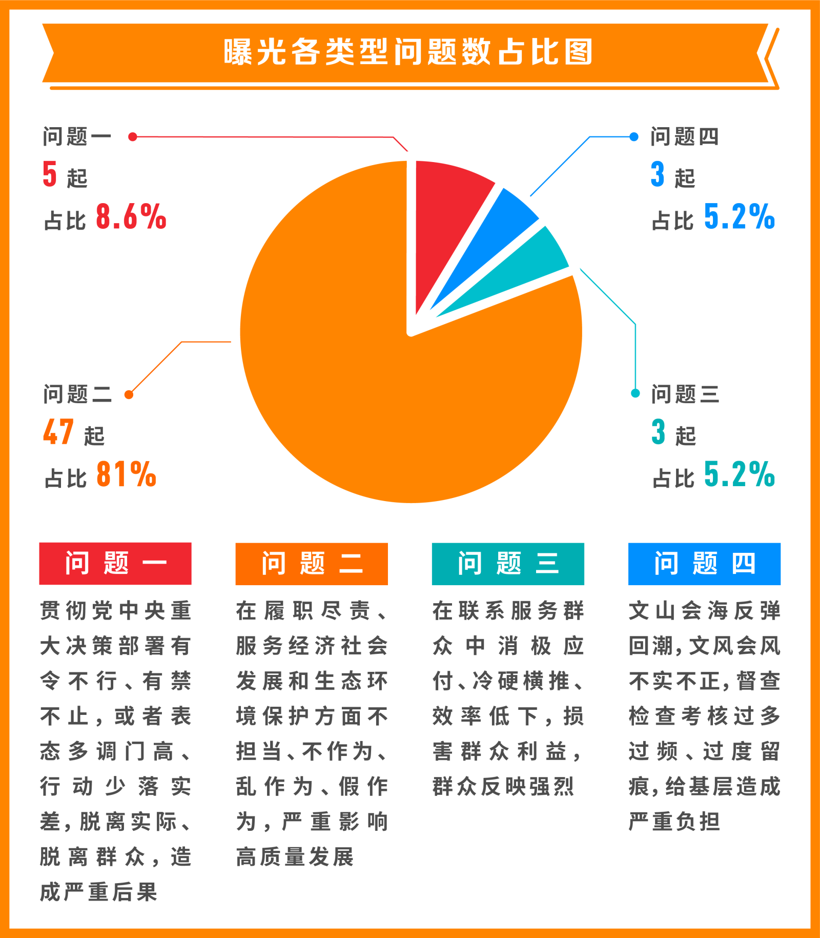 從具體問題類型看,“貫徹黨中央重大決策部署有令不行、有禁不止,或者表態多調門高、行動少落實差,脫離實際、脫離群眾,造成嚴重后果”方面問題5起,占比8.6%;“在履職盡責、服務經濟社會發展和生態環境保護方面不擔當、不作為、亂作為、假作為,嚴重影響高質量發展”方面問題47起,占比81%;“在聯系服務群眾中消極應付、冷硬橫推、效率低下,損害群眾利益,群眾反映強烈”方面問題3起,占比5.2%;“文山會海反彈回潮,文風會風不實不正,督查檢查考核過多過頻、過度留痕,給基層造成嚴重負擔”方面問題3起,占比5.2%。