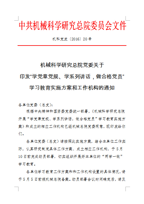 機械科學(xué)研究總院黨委關(guān)于印發(fā)“學(xué)黨章黨規(guī)、學(xué)系列講話,做合格黨員”學(xué)習(xí)教育實施方案和工作機構(gòu)的通知