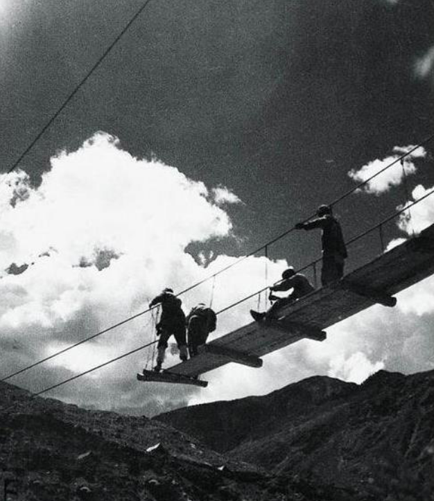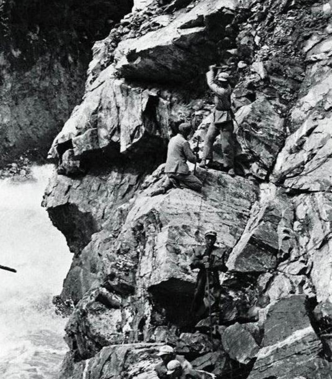 圖為在懸崖峭壁上打炮眼的解放軍戰(zhàn)士。