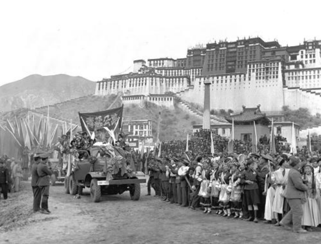從青藏公路開到拉薩布達(dá)拉宮前的汽車隊(duì),受到當(dāng)?shù)厝嗣竦膴A道歡迎