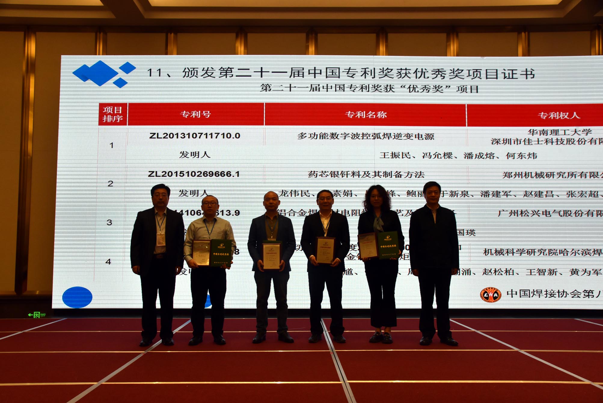 中國焊接協(xié)會會長俞培根、副會長楊玉亭分別為榮獲“第二十一屆中國專利優(yōu)秀獎”的深圳市佳士科技股份有限公司、鄭州機械研究所有限公司、廣州松興電氣股份有限公司、哈爾濱焊接研究院有限公司,頒發(fā)了第二十一屆中國專利獎獲優(yōu)秀獎項目證書。