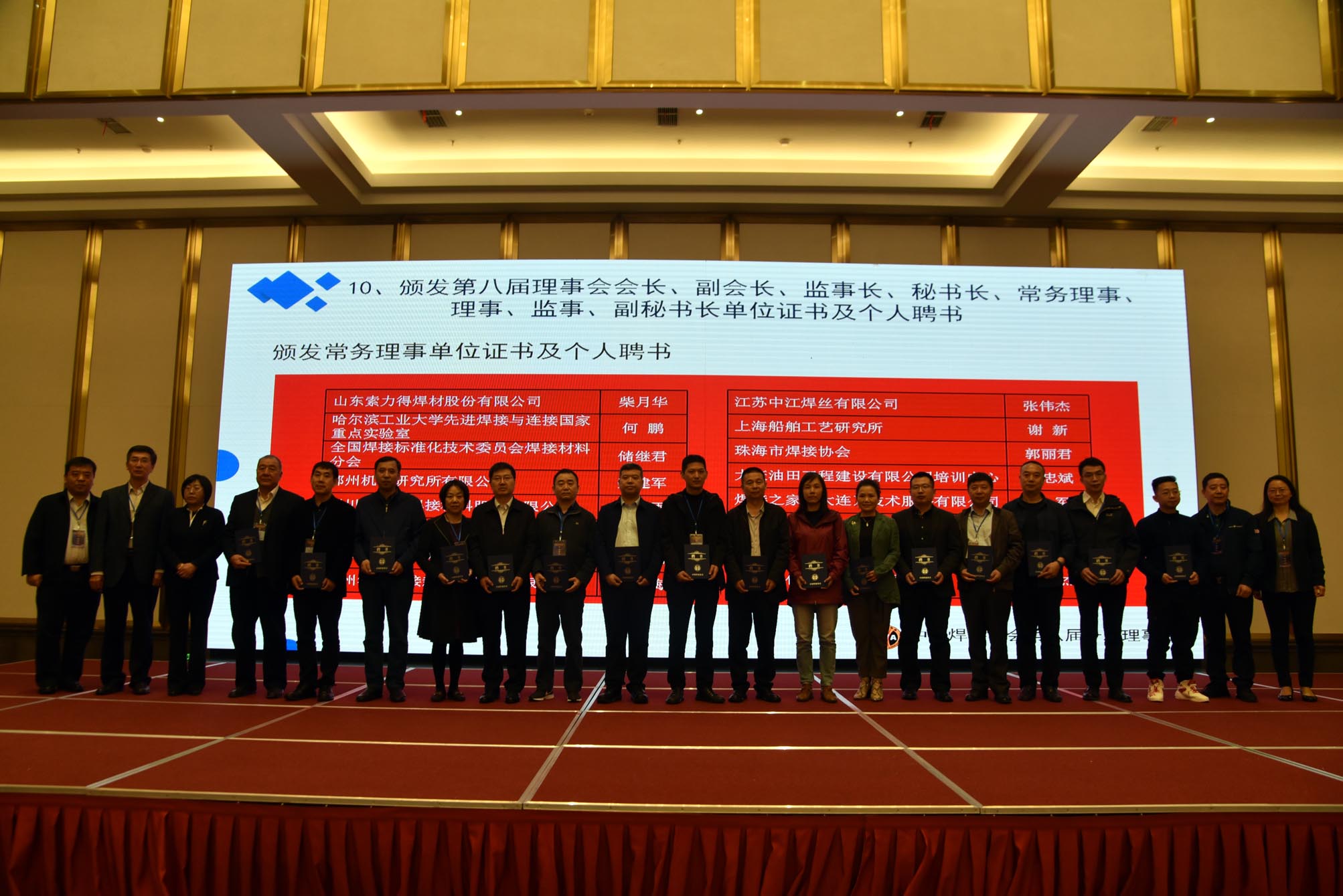 國資委協(xié)會黨建局裴毅東副處長、中國機械工業(yè)聯(lián)合會執(zhí)行副會長趙馳、中國焊接協(xié)會會長俞培根為新任監(jiān)事長馮美娟,副會長王魯君、龍偉民、葉德平、劉長城、劉申、李連勝、李東、楊玉亭、張寧紅、陳樹君、柳錚、侯云昌、袁兆富、魯彤、謝偉新、樊險峰頒發(fā)聘書。