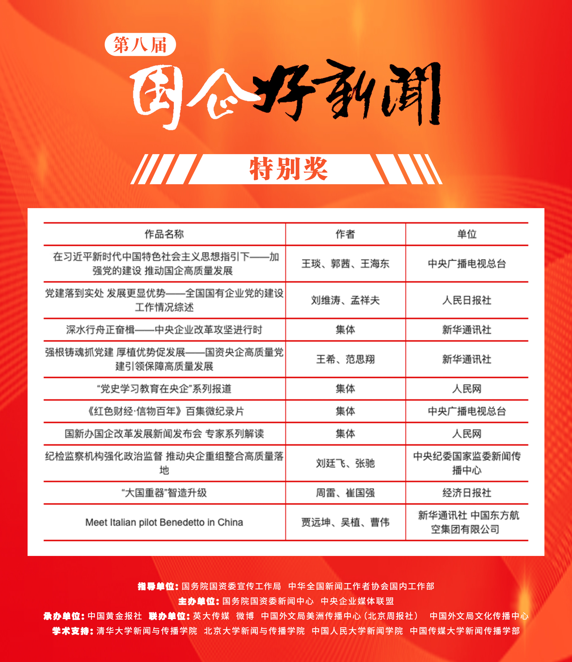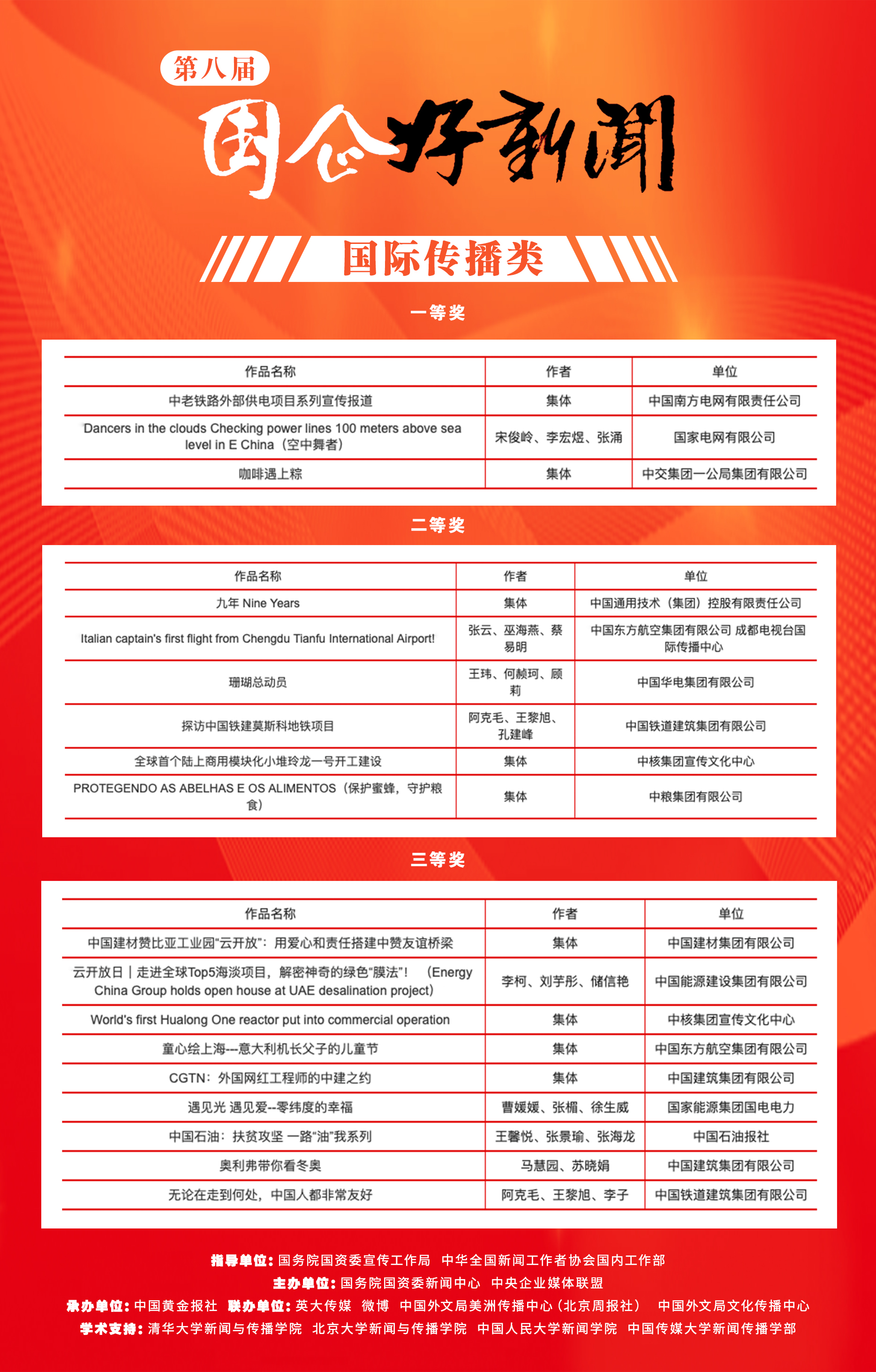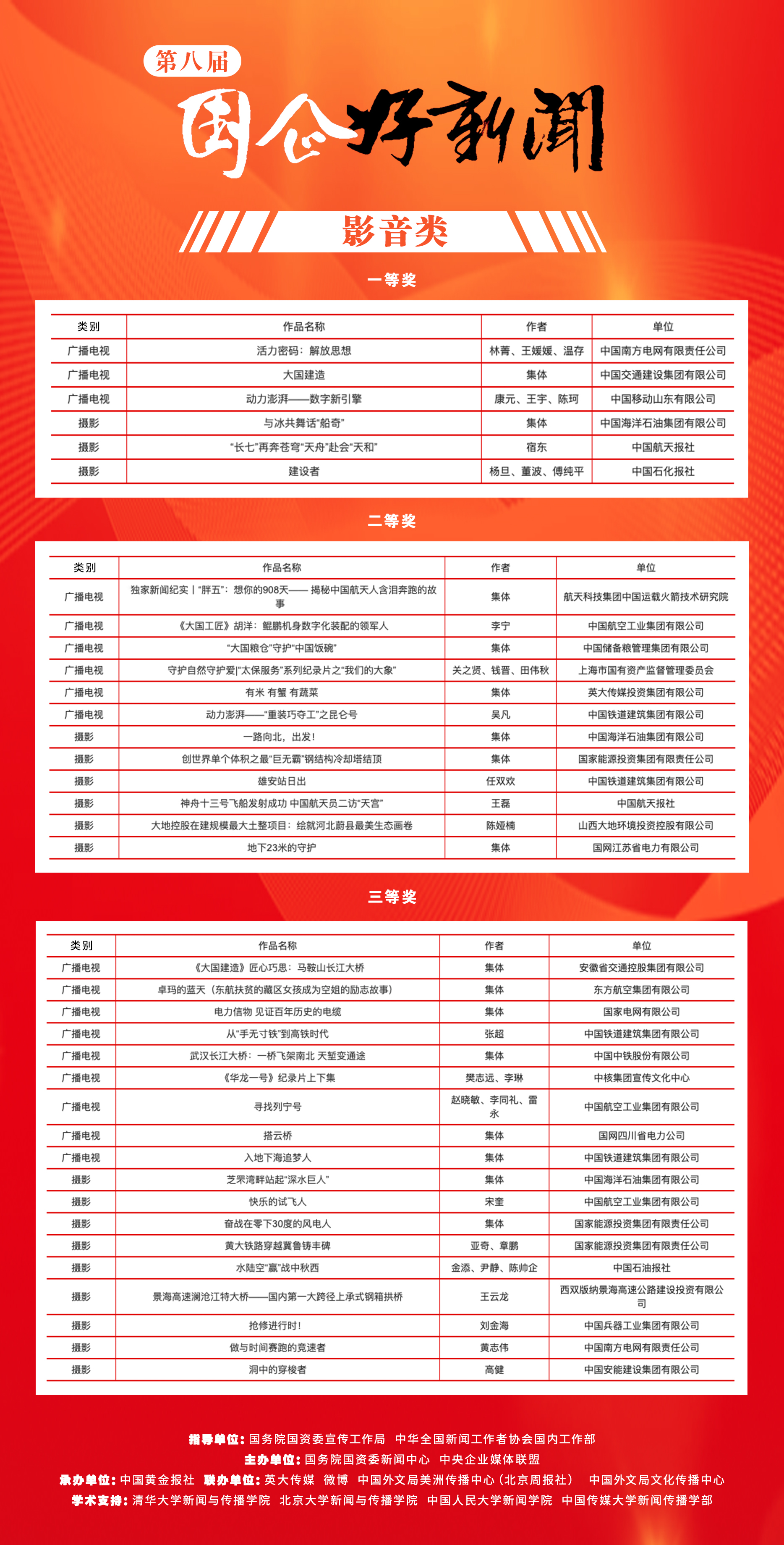 1月11日,第八屆“國企好新聞”推介歷經單位推薦(自評)、專家復評、終評、公示等環節,3772件申報作品中,227件精品榮膺“國企好新聞”。其中,一等獎32件、二等獎66件、三等獎99件,優秀獎20件,專家評委會還給予主流媒體的10篇精品力作“特別獎”;20個單位獲得組織獎,5個單位榮獲突出貢獻獎,10名新聞創客從73位申報者中脫穎而出,為國資國企宣傳隊伍和主流媒體搭建交流、對標平臺,匯聚國資正能量、傳播國企好聲音。這些“國企好新聞”作品,生動地再現了極不平凡的2021年國企改革發展黨建,清晰地勾勒了可親可愛可敬的新國企形象。